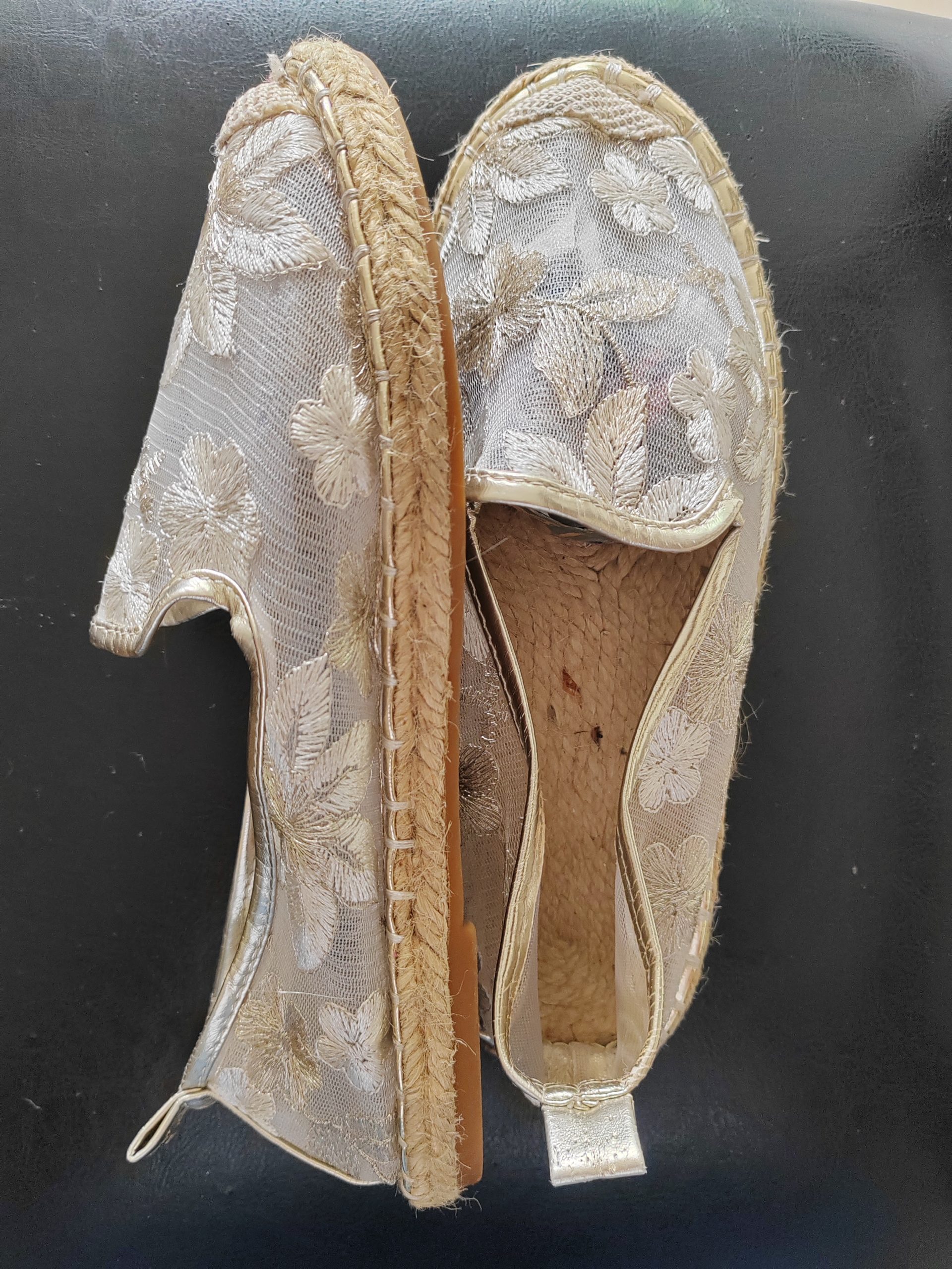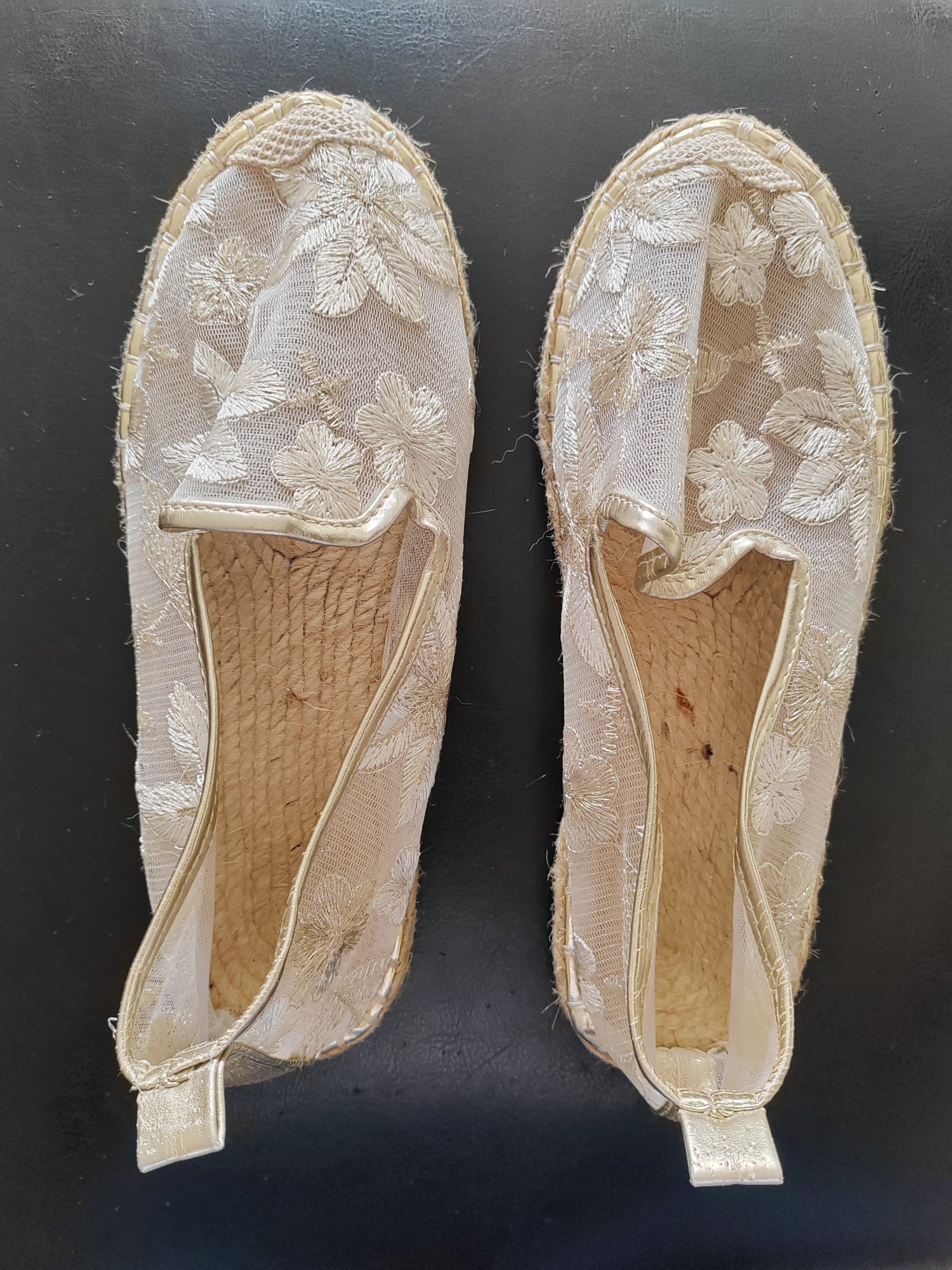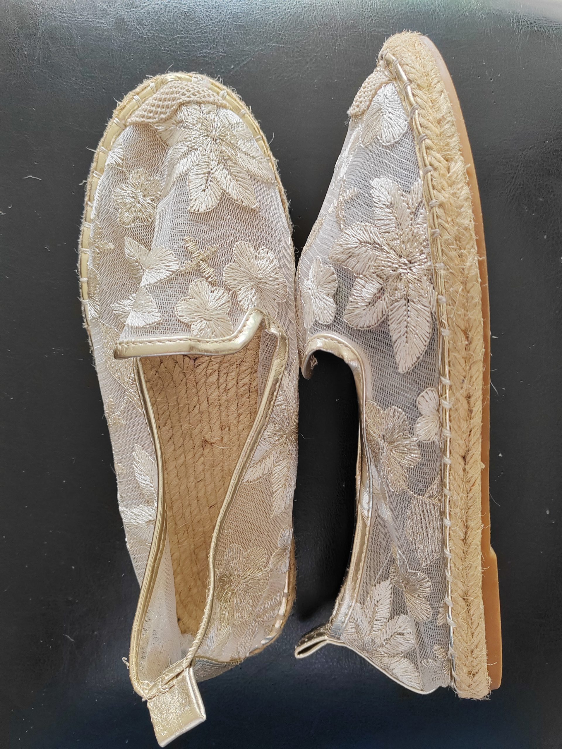 De malla, cosidas a mano, suela de caucho, talla 38 pero corre pequeño.