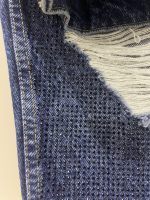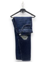 Pantalón denim de corte masculino carrot fit talla 31/40 con botonadura delantera y desgaste en las rodillas ( roto que se observa la piel debajo ) en color azul índigo con pedrería pegada en la parte frontal que se degrada en intensidad e abajo hacia arriba todo en perfectas condiciones y sin ajustar en bajos ( las piedras son cristalitos en color negro ).